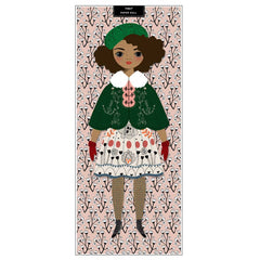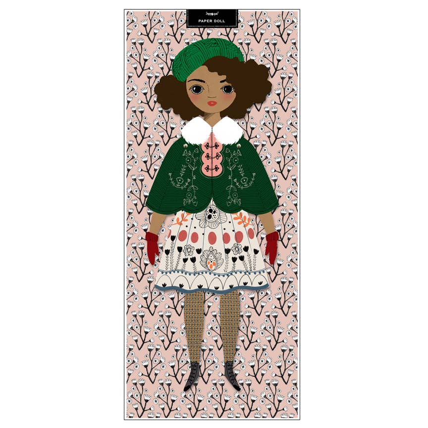 Diese vollständig zusammengebaute Papierpuppe ist mit einem Klettverschluss am Hintergrund befestigt und kann leicht entfernt und wieder angebracht werden. Entfernen Sie die Puppe, um mit ihr zu spielen oder ihre Outfits zu wechseln. Mini-Metallklammern werden verwendet, um die Puppe zusammenzubauen und spielerische Bewegungen zu ermöglichen. Wenn Sie neue Puppen zu Ihrer Sammlung hinzufügen, können Sie die Garderobe nach Belieben kombinieren. Verpackt in einer klaren Zellophanhülle. Verpackungsgröße: 5,5" x 13". Größe der zusammengebauten Puppe: 12" hoch.